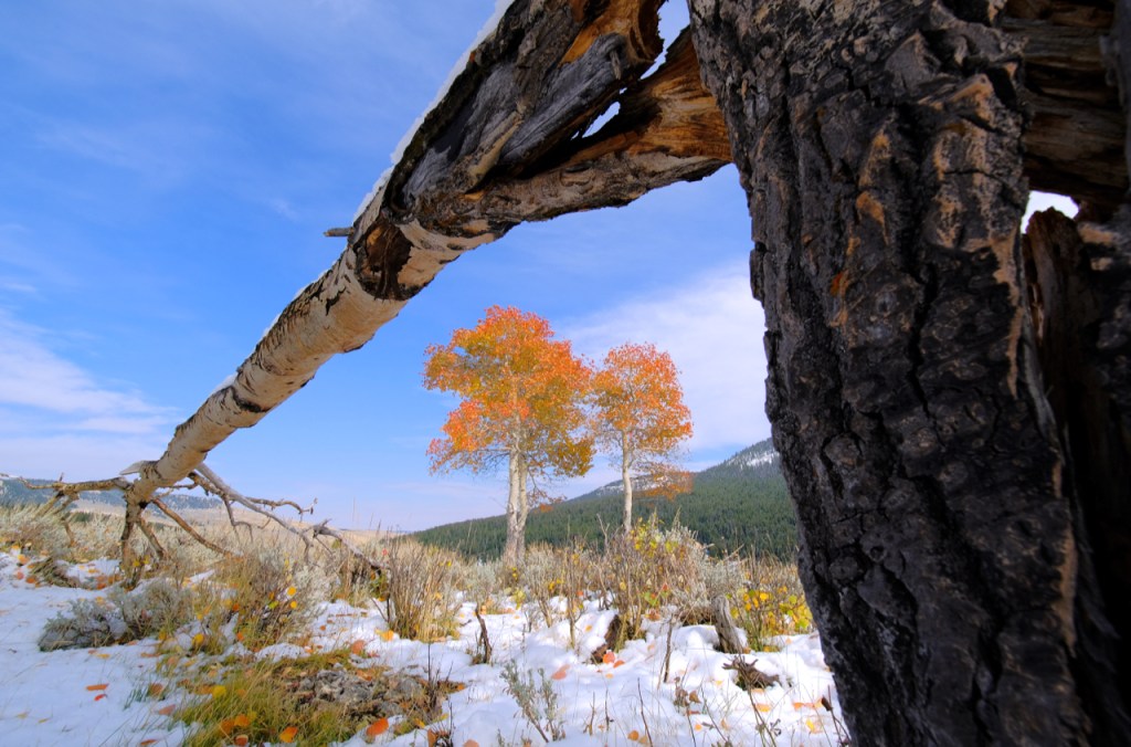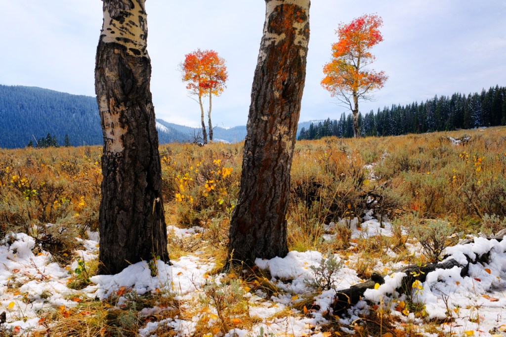 When I walk to a cluster of aspen trees in peak color I explore all of the possible angles, often without my camera. I roam around the trees, walk under them, walk away and maybe look for an interesting foreground element I could use. I try to spend as much time as possible with scene to make sure I walk away with some compelling images.